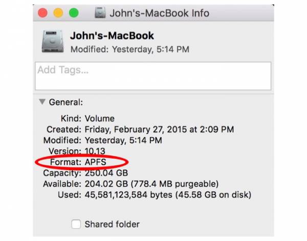 Как убедиться, что диск был конвертирован в APFS. Для этого кликните на иконку загрузочного диска на рабочем столе (или перейдите Finder > «Настройки» > «Общие»). Удерживайте клавиши Command и «I». Отобразится информация о диске, в том числе о файловой системе.