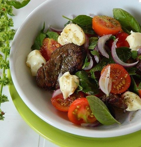4. Выложить на стеклянное блюдо листья салата, соединяя их в центре, чтобы не было «дырок». Далее выкладывать слоями: половинки черри (или других помидоров), лук, бекон. Влить половину заправки. Добавить гренки. Тщательно перемешать в центре, а по краям оставьте слоями. Сверху выложить куриную печень, полить оставшейся заправкой и приправить черным молотым перцем. Салат с куриной печенью подавать теплым.